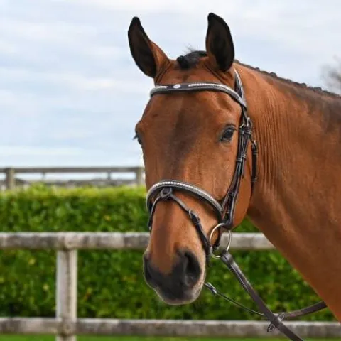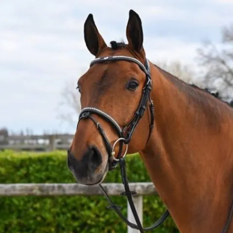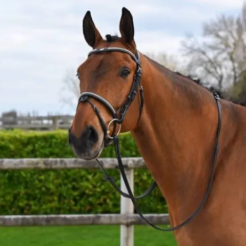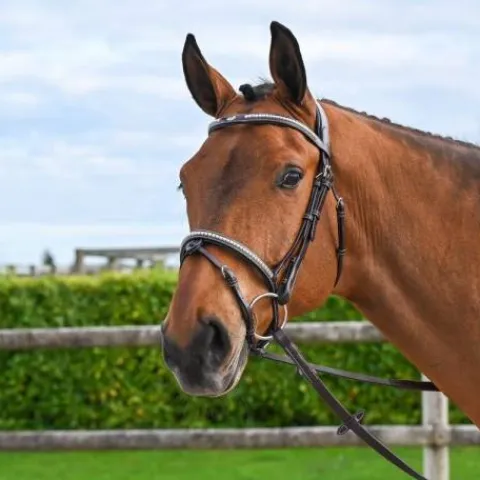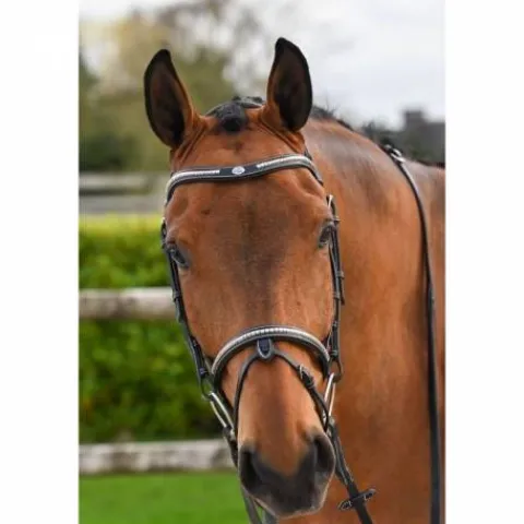 - Le frontal et la muserolle sont ornés du détail clincher qui ajoute une touche d’élégance et de charme à ce bridon.