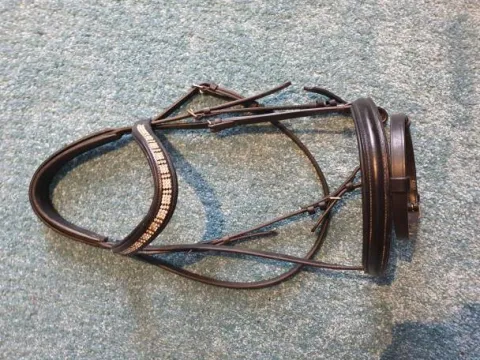 Bridon en cuir noir, porté une quizaine de fois, manque un strass sur le frontal mais cela ne se voit presque pas