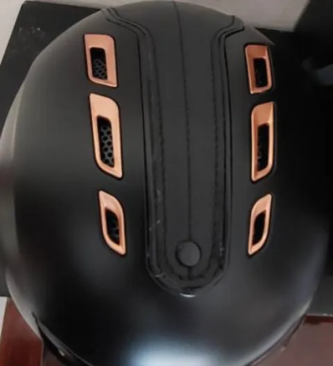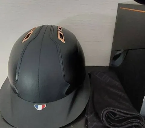 Neuf, sortie de boite pour photos. Taille S 52-54 cm Modernité & élégance. Vendu par Aurak 359 euros Rehaussé de ventilations en métal cuivré, notre modèle noir mat Polaris offre un mélange subtil de modernité et d’élégance. Sangle et pads d’oreilles en cuir de vachette pleine fleur. Fourni avec 3 doublures intérieur détachables. Fiche technique • Certifications : certifié par le laboratoire français POURQUERY : ICERTB07/001 + EPI UE 2016/425 + NF EN 1384:2017 + NF EN 1384:2023 • Ventilations : véritable métal injecté finition or rose • Coque : ABS injecté, finition noir mat • Système de fixation : système breveté Fidlock, pour une fixation de sangle ultra rapide et simple plus une très grande sécurité en cas de chocs. • Calotin : haute sécurité, ultra ventilé • Gainage du casque : cuir pleine fleur résistant aux intempéries • Doublure intérieure : façon Alcantara 13 coussins de confort • Logos et bouton pression : métalliques et bouton tête en verre • Grilles de ventilation : métalliques • Points de fixation : casque avec 4 points de fixation • Sangle et pads oreilles : cuir pleine fleur • Matériaux : matériaux haute qualité certifié REACH pour le respect de la planète et de l’humain • Conception : surpiqûre, couture, assemblage et montage à la main Nos casques sont surpiqués, cousus, assemblés et montés entièrement à la main, ce qui signifie que chaque casque est quasiment unique c’est la raison pour laquelle quelques légères différences peuvent apparaitre entre deux casques de même modèle. Fournis avec un sac de rangement en coton.