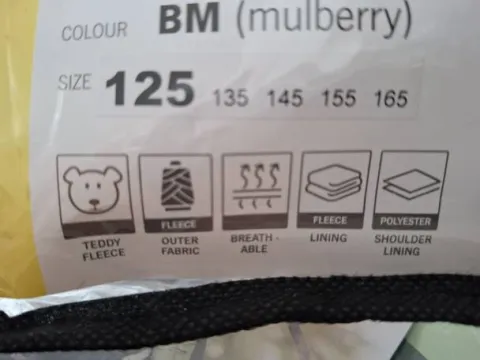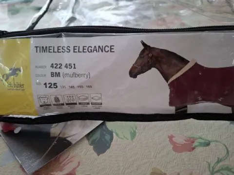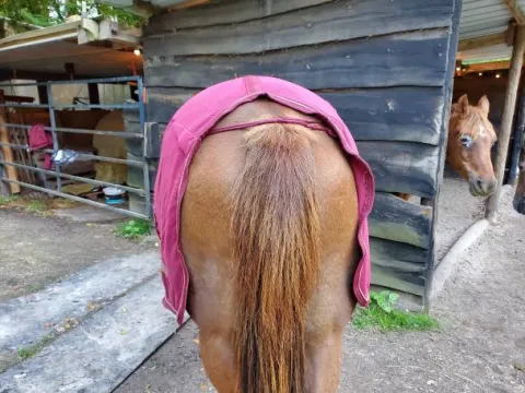 vends couverture servie 3 fois car trop juste pour ma jument. le col est en polaire teddy.doublure lisse avec matelassée pour protéger la robe. double fermeture de poitrail avec crochets en T. courroie de queue 100% polyester et susangles croisées réglables. longueur de dos 125 cm prix d achat 64 euros. a vendre 35 euros