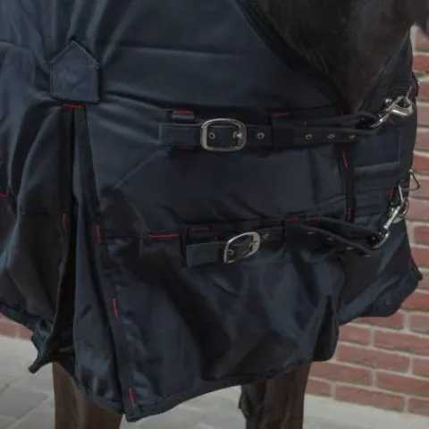Le cheval garde une grande liberté de mouvement grâce aux nombreux systèmes de fixations et d’ajustement: un soufflet d’aisance d’épaule, de sursangles croisées réglables, de courroies de cuisses amovibles par mousquetons, d’une courroie et d’un rabat de queue imperméable.