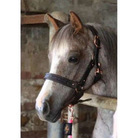 Ce licol en cuir marron se distingue par sa bande de disco noir sur la muserolle et la têtière, ajoutant une touche d’élégance à votre équipement équestre. Les boucles en or rose complètent ce design raffiné, offrant une esthétique moderne et chic.