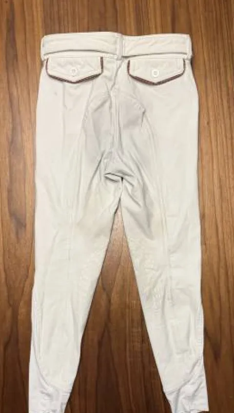 Pantalon de concours Pénélope blanc avec des bordures en cuire brune au niveau des poches