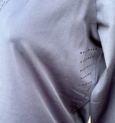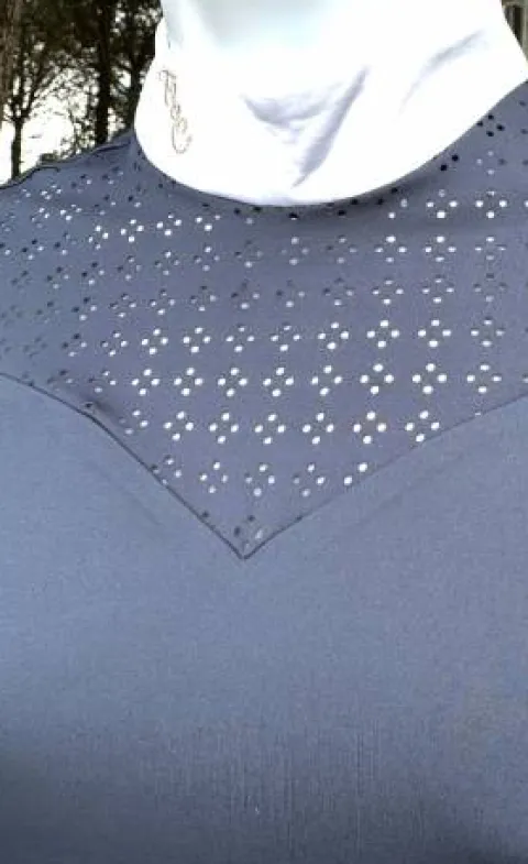 Magnifique polo de concours manches longues en tissu technique avec découpes laser sur le haut de la poitrine
