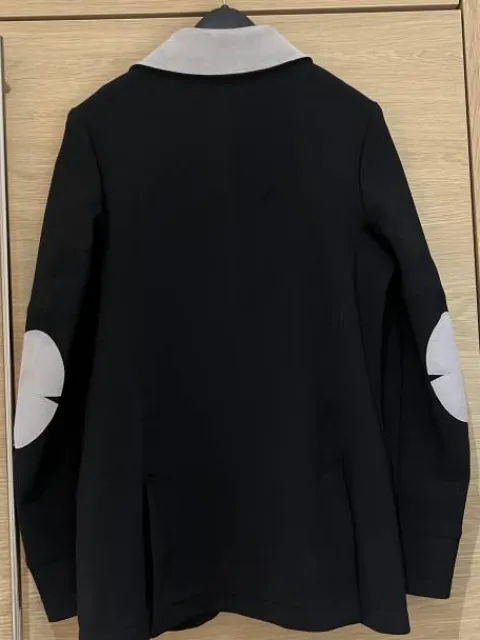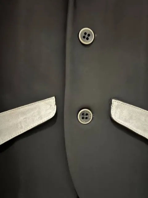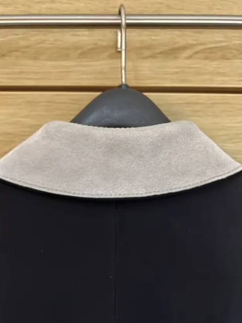 Noire avec rabats de poche, col et coudières en suédine grise. Fermeture par 3 boutons.