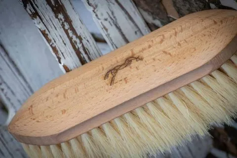 Bouchon à poils longs Pénélope et dessus en bois avec le logo Pénélope marqué dans le bois. Les poils sont longs et souples pour brosser sans irriter.