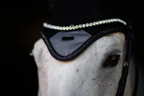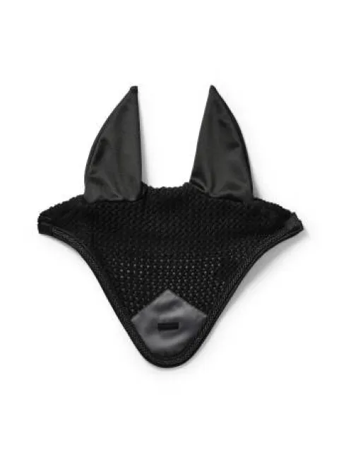 Bonnet anti-mouches crocheté dans une belle couleur noir. Décoré d’un patch en satin gris sur le devant, une bordure noire, une cordelette noir avec fils argentés et d’un badge Equestrian Stockholm en noir.