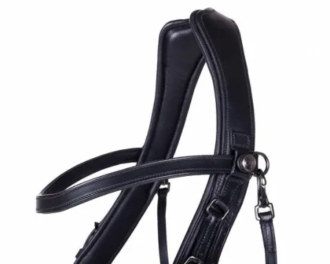 - La muserolle est placée suffisamment haut pour éviter la pointe de l’os nasal et est également rembourrée en gel