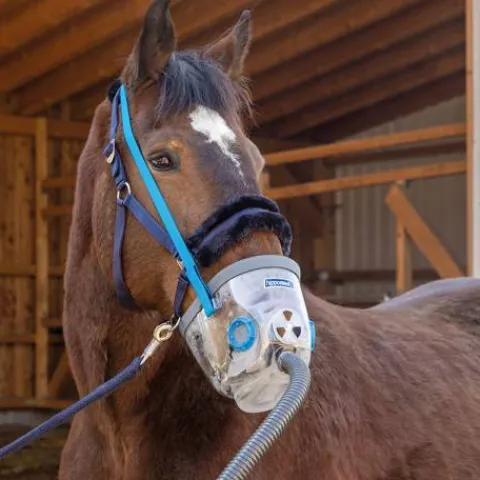 Le masque du cheval est transparent pour contrôler facilement que l’inhalation est correcte. Le joint en caoutchouc est souple et flexible, ce qui assure une forme ajustée et optimale du masque.