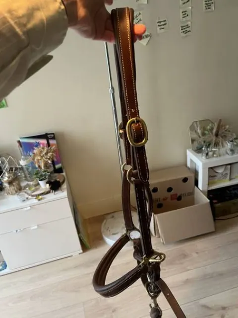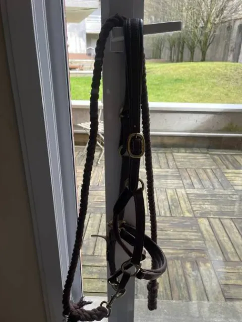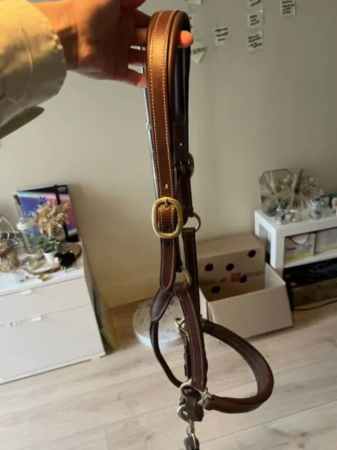 Licol en cuire marron, taille COB, acheté au salon du cheval. Excellente qualité, très peu utilisé