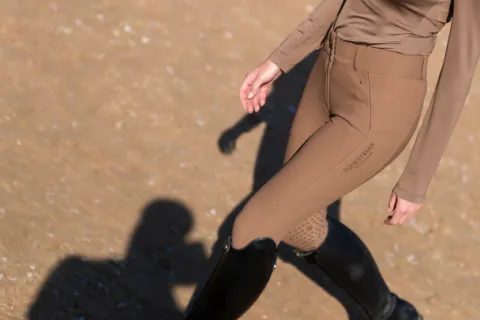 Pantalon de couleur beige/marron avec un logo Equestrian Stockholm. Pantalon avec une taille mi-haute, 4 poches; deux avec un zip et 2 pour le smartphone sur les côtés.