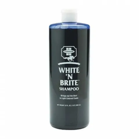 Spécial chevaux aux robes claires ! White’n Brite shampoing apporte éclat et beauté aux robes claires. Il enlève même les tâches jaunes les plus incrustées. A base de dérivés d’huile de coco, White’n Brite shampoing, grâce à son agent blanchissant, détache les robes claires tout en hydratant poils, queue et crinière.