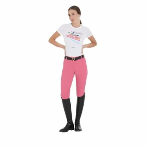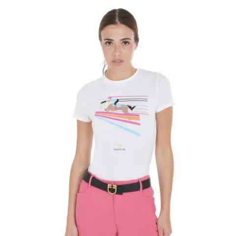 T-shirt manches courtes en coton slim fit pour femmes, parfait pour la saison estivale. Il garantit une grande liberté de mouvement et un confort maximal, facilitant également l’évaporation et la dispersion de la sueur. Le t-shirt est orné d’un cheval sautant coloré