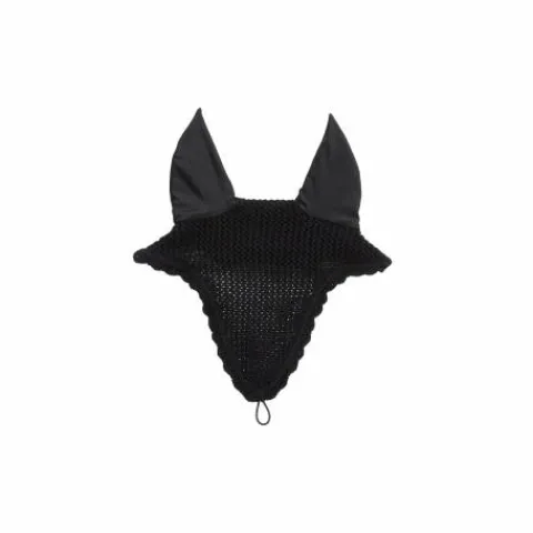 La matière autour des oreilles est extensible et ajustée. La partie du cou est plus longue pour éviter que le voile ne glisse. La partie avant, également allongée, s’attache facilement à la muserolle grâce à une boucle. Disponible en noir, bleu marine et marron