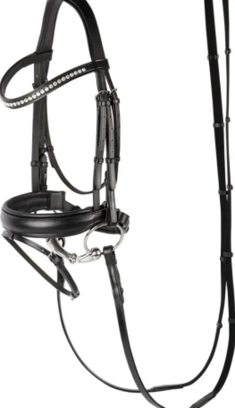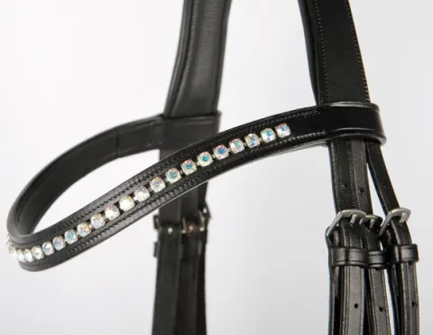 Luxueux bridon en cuir de haute qualité avec muserolle combinée large et matelassée, et frontal verni décoré de cristaux. Vendu avec rênes sangles.