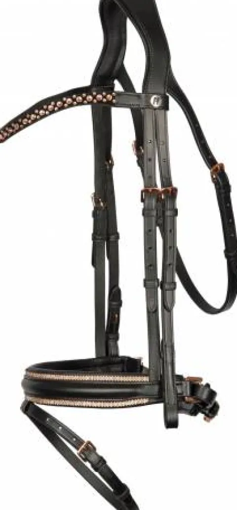 Luxueuse bride avec rembourrage doux sous la têtière et la muserolle. La muserolle est de forme anatomique et plus étroite au niveau du mors. Fabriqué avec des boucles en or rose et de beaux cristaux en or rose sur le frontal et le long de la muserolle. Têtière très confortable et de forme anatomique pour une meilleure répartition de la pression.