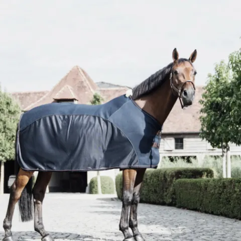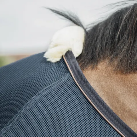 Cette couverture est une combinaison parfaite entre la chemise anti-mouche et notre tissus 3D Spacer. Sur la partie du dos : le 3D spacer, une structure alvéolée légère mais solide, absorbera la sueur tout en gardant votre cheval au sec. Sur la partie inférieure : le tissu anti-mouche qui n’empêchera pas seulement les insectes de déranger votre cheval, mais favorisera également la circulation de l’air. Ce qui permettra à votre cheval de progressivement se refroidir. Les matériaux utilisés sont spécialement conçus pour que les poils n’y adhèrent pas, ce qui rend la chemise plus agréable à porter.