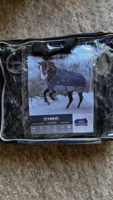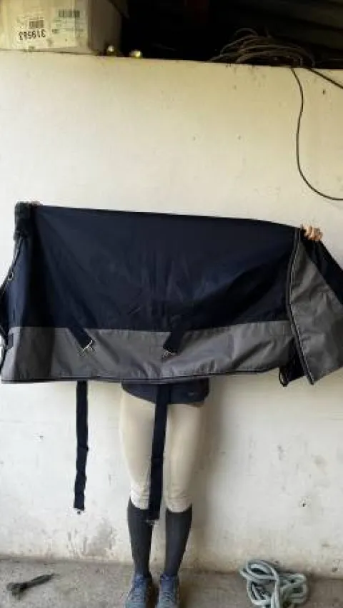 Couverture imperméable Equithème, modèle Tyrex, taille 105 cm, non grammée (0 gr), 600 deniers, bleu marine et grise.