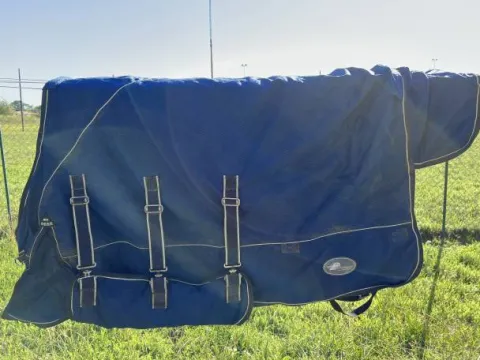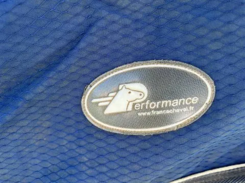 Couverture Performance bleu taille 125 400g avec rabat sous le ventre. La couverture a un denier de 840, ce qui fait qu’elle est incassable. La couverture est en très bonne état, malgré un accros qui ne se voit pas et ne gêne en rien sont utilisation. Elle dispose d’un protège garrot. Elle est à vendre avec le couvre-cou Performance bleu en taille médium, ce qui correspond à une taille 125 – 130, pour un poney D.