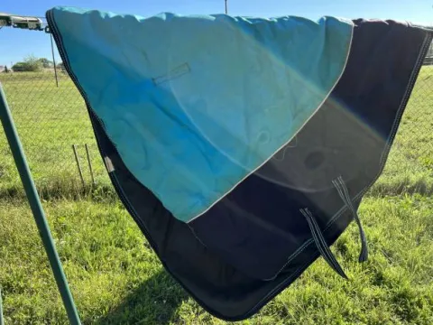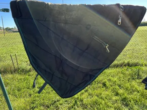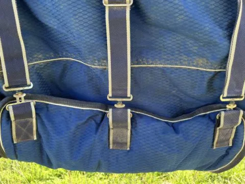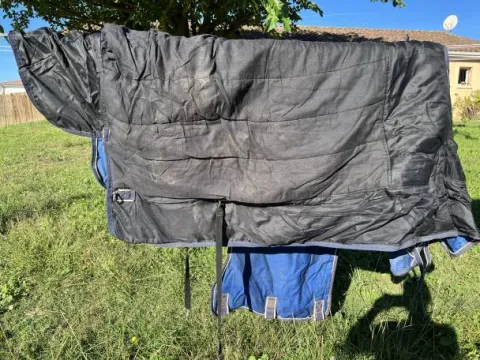 La couverture a était très peu portée (environ 15 jours). La couverture et le couvre-cou sont imperméable comme indiqué sur les photos.