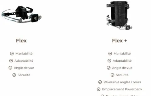 Fixation Flex+ : En plastique souple. Idéale pour y insérer une batterie externe. Réversible, s’adapte aux angles et paroi. Fixation par vis ou par sangles Fixplus*.