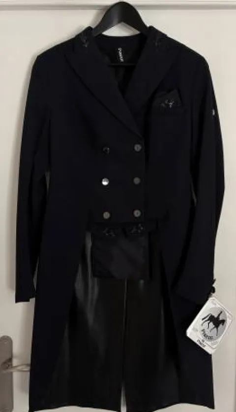 Frac de dressage très chic avec applications de strass. Fabriqué en softshell respirant de haute qualité. Coupe ajustée. Lavable en machine.