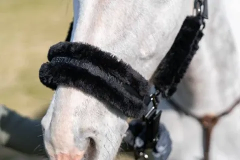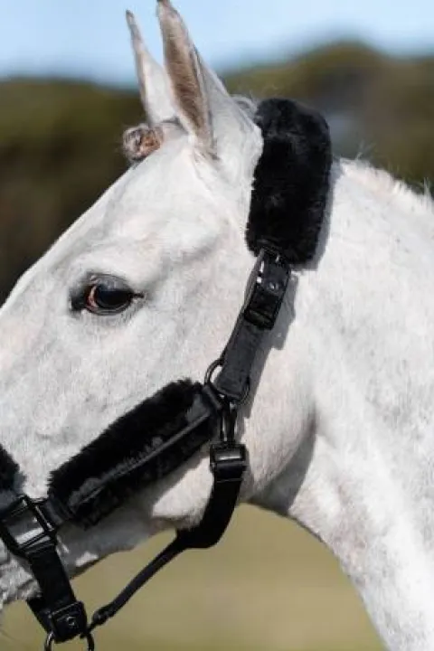 - Licol confortable avec fausse fourrure. Conçu dans une élégante couleur noire, avec une fausse fourrure noire et des boucles chromées. Orné de l’élégant badge Equestrian Stockholm en noir et du logo Equestrian Stockholm sur la muserolle.