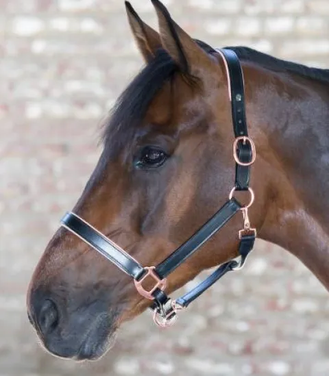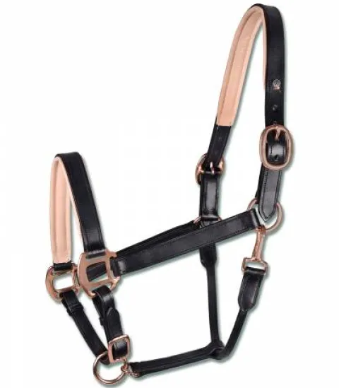 - Élégant licol en cuir dont la muserolle et la têtière sont rembourrées.