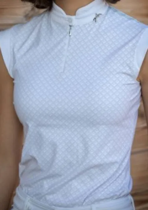 Polo de concours manche courte Pénélope, gris et blanc, avec un imprimer du logo sur toute la surface du polo