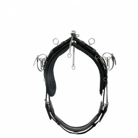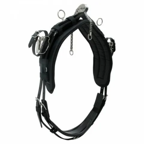 Harnais QH modèle automatique complet, comprend une sellette en véritable biothane avec système d’enrênement automatique, un pad en mousse, une sangle en caoutchouc, une croupière avec culeron à boucles, une bricole type à la française, une paire de guides avec poignées avec dés pour fixation de débouche oreilles ainsi qu’une bride complète avec enrênement et tour de nez de muserolle.