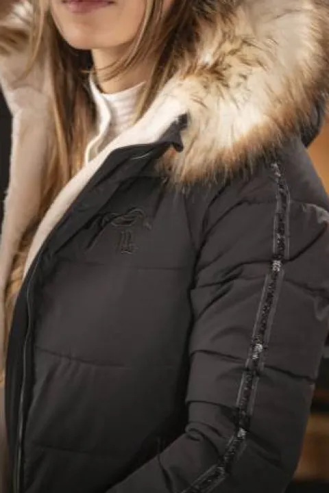 Blouson type doudoune noir au matelassage épais et horizontal et au tissu stretch très confortable. De chaque côté, des bandes stretch de bord-côtes ajoutent au confort de ce vêtement d’hiver. À l’intérieur, une belle polaire ultra-douce assure un bon apport de chaleur pour la saison hivernale aux écuries. Un galon verni et pailleté descend le long des bras. Le log Pénélope est brodé en relief en ton sur ton sur le coeur. La capuche est amovible et cerclée d’une magnifique fausse fourrure. Il y a un grand zip central et deux poches zippées sur les côtés.