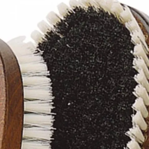 Brosse douce Sprenger en bois avec poils noirs et bordure blanche. Avec passe main en cuir. Idéale pour le pansage.