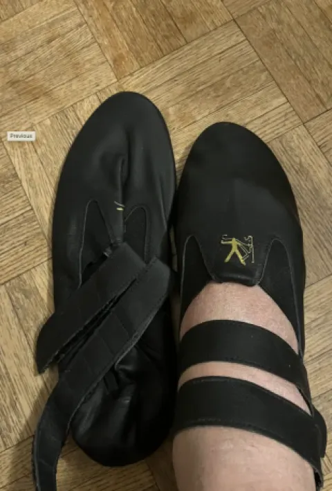 Chaussons de voltige noirs « Professionnels », jamais portés en cuir, semelle antidérapante, 2 straps ajustable au pied et coup de pied pour un excellent maintien (peuvent se raccourcir si besoin)