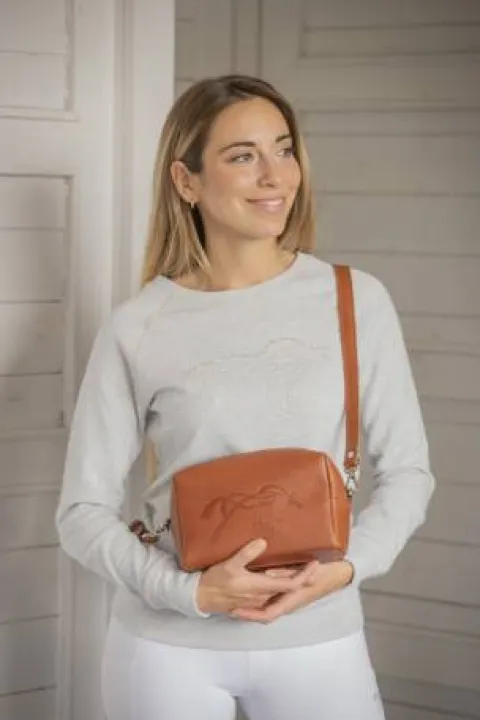 Petit sac à main rectangulaire PENELOPE « Laly », zippé sur le dessus, confectionné dans un joli cuir grainé cognac et rehaussé d’un piping doré sur la bandoulière et la poche arrière. Au centre, sur la face extérieure du sac, on trouve le double logo Pénélope et celui de l’amitié, tous les deux embossés. Ce sac est parfait pour transporter tout le petit nécessaire d’une femme au quotidien.