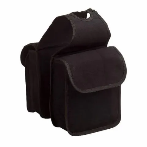 - Petites sacoches doubles en canvas bordé nylon à passer par dessus le pommeau d’une selle western.