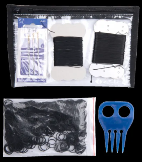 Jolie pochette pour la compétition comprenant un sachet d’élastiques, un peigne de tressage, trois aiguilles, un ciseau et deux sets de fils (noir et blanc)