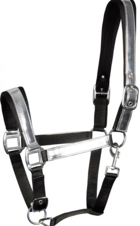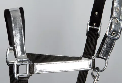 - Licol avec détails argentés sur la têtière et muserolle, doublure en neoprene pour plus de confort.