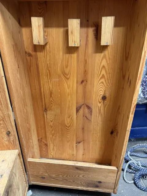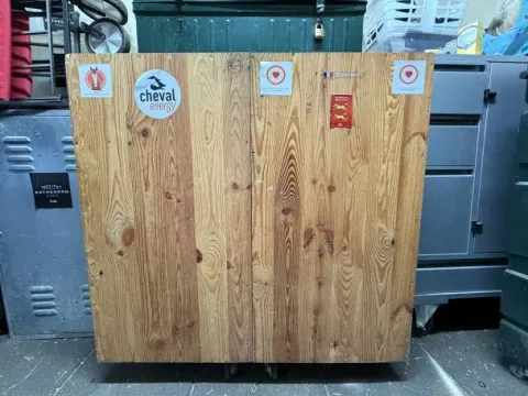 Malle de rangement sellerie. Elle possède : un porte selle, 2 grands tiroirs, 3 portes filets, 3 grandes étagères, 2 crochets qui ont été rajouté.