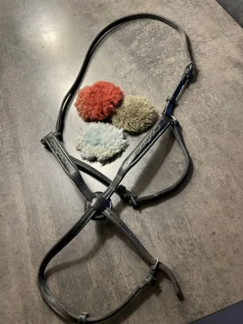 Muserolle croisée noire en cuir, en bon état. Vendue avec 3 moutons (rouge, vert, bleu).