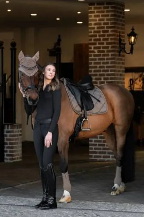 Ce bonnet anti-mouche a été conçu pour allier protection et esthétique. Sa fabrication en coton crocheté assure un confort optimal tout en préservant votre cheval des insectes. Les oreilles en Softshell, une matière innovante et respirante, garantissent une sensation agréable, même par temps chaud. La combinaison de cordelette et de perles ajoute une touche d’élégance, tandis que l’inscription Eskadron sur l’oreille souligne le savoir-faire de la marque.