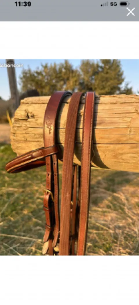 Vend Bridon de la marque équipe emporio Très bon état Couleur marron Muserole croisée Vendue avec paire de rênes de la même marque en cuir doublé caoutchouc très souple