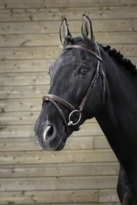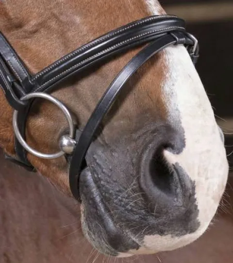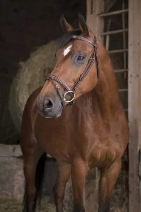 - Têtière découpée, frontal et muserolle combinée doublés cuir vachette, coutures blanches, crochets sur les montants de mors.
