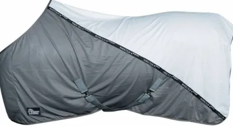 Couverture en maille bicolore à utiliser comme couverture anti-mouches ou couverture rafraîchissante, fermeture avant par velcro simple, deux sursangles croisées, boucle de queue, doublée de nylon à l’avant pour éviter les taches de calvitie.