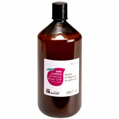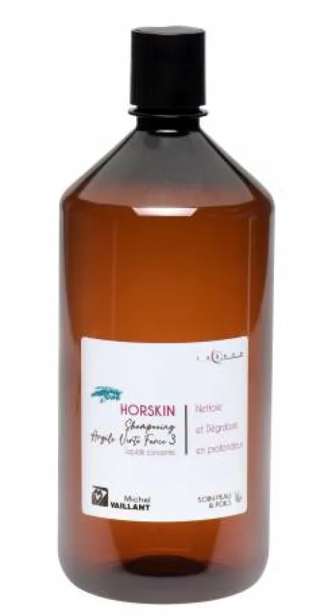 Le Shampooing Liquide Concentré Horskin Argile Verte Force 3 nettoie et dégraisse le pelage. Résultats spectaculaires : la robe est éclatante et douce quelle que soit sa couleur. Facilite également le brossage des crins.
