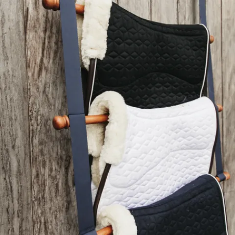 Ce porte Tapis vous permettra de ranger vos tapis de selle dans votre sellerie, en assurant leur ventilation. Un accessoire indispensable aux écuries ou sur les concours, ce porte tapis est fait de bamboo ainsi que d’un tissus bleu marine pour un look très chic et accordé à l’ensemble de nos produits pour les écuries. Il peut porter jusqu’à quatres tapis de selles et il est équipé d’une boucle ainsi que d’une cordelette pour l’attacher pourtout où vous le souhaitez.