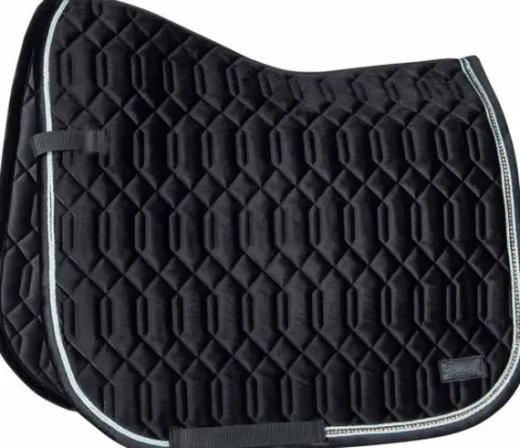 Tapis de selle avec double cordon décoratif fin et cristaux à l’arrière, écusson sur le côté gauche, passants pour selle et sangle.