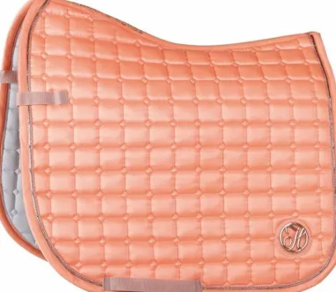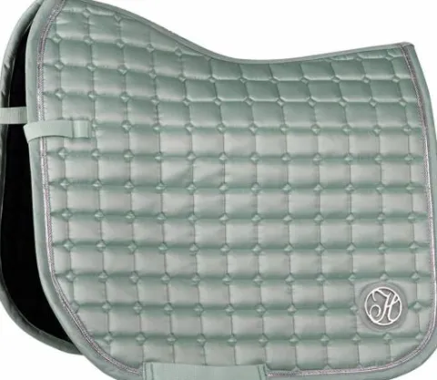 Tapis de selle en matière luxueuse « Satin ». Équipé d’un cordon et d’un passepoil métallique. Équipé d’un passant de sangle et de velcro sur les attaches de contre sanglons