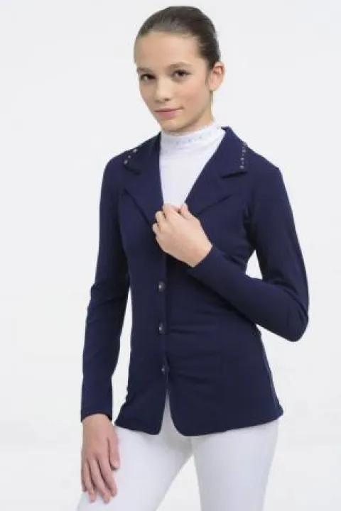 Adaptée aux besoins des adolescentes, cette veste de concours très extensible en tissu technique softshell piqué et technologie ‘Second Skin’ (seconde peau) confère une totale liberté de mouvement et permet des performances maximales sur le terrain. Cette veste d’équitation sans doublure a une coupe très ajustée pour flatter toutes les morphologies, offrant une silhouette mince et élégante. Elle suit les mouvements du corps grâce à sa coupe et son élasticité, et est ornée de cristaux sur le col. Des polos de concours assortis sont également disponibles.
