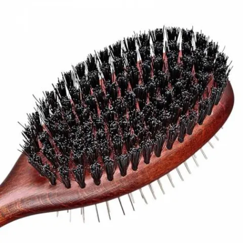 Brosse à crins Sprenger en bois, une face en poils métalliques chevillés sur caoutchouc, une face en poils souple. Avec manche.