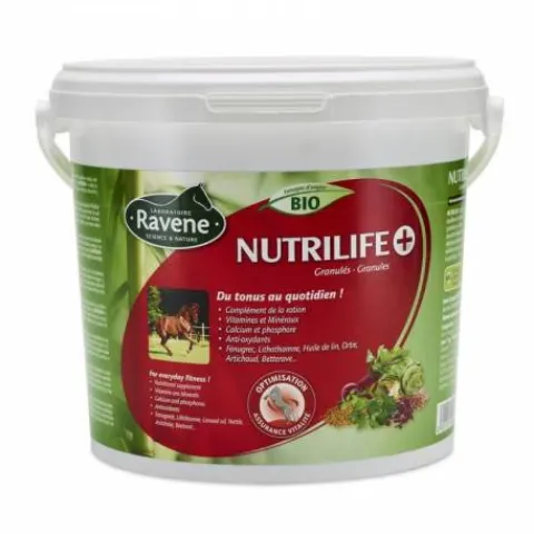 NUTRILIFE + apporte à votre cheval tous les micro-éléments essentiels nécessaires (minéraux, vitamines, acides aminés…) pour équilibrer la ration afin d’optimiser sa vitalité et sa condition physique. La ration quotidienne d’un cheval – en général, foin et granulés ou céréales – apporte les calories et les fibres nécessaires, mais peu de vitamines et minéraux. Ces micro-éléments sont pourtant indispensables à sa santé. Enrichi en levures et doté d’un ratio d’oméga 3 et 6 soigneusement calculé, NUTRILIFE + est idéal pour optimiser le métabolisme de votre cheval : il apporte en particulier du calcium et du phosphore, 2 minéraux indispensables, solidité des os, des vitamines E et C ainsi que du sélénium. Il est difficile de garantir une ration de base riche en vitamines et minéraux au quotidien, c’est pourquoi les plus grands professionnels du cheval utilisent des compléments tels que NUTRILIFE +